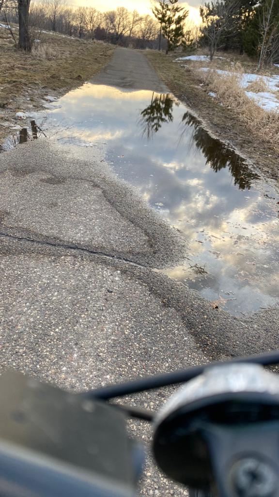 “रौशनी के सिम्त से परछाई तो लम्बी हो सकती है. लेकिन हमारी उम्र में, आदमी कभी लम्बा नहीं होता धन्नो”, यह सुनके धन्नो हंस कर बोली, “ठीक कहा, लेकिन मैंने तो युहीं मज़ाक़ किया था”. ट्रेल पे कहीं कहीं धुप नहीं पड़ती है, कहीं थोड़ी नीची होने से रस्ते की बर्फ पिघल कर पानी जमा होगया था. मुझे अपने बचपन के शहर दरभंगा की याद आगयी. वहां बरसात के बाद, सड़क पर छोटे गधे हो जाते हैं, और उनपे पानी भरा होता. हर सवारी संकीर्ण सड़क को साझा करती है. हमारी Atlas साइकिल, उस गधे को बड़ी शान से पार कर लेती थी. मैं धन्नो को महसूस कर पा रहा था, अकेले ट्रेल पे उसका राज था. फिर भी पानी भरे रास्ते से पास करते हुए वो धीरे हो जा रही थी. मैंने धन्नो से कहा Atlas साइकिल से TREK Bike बनने में कितना कुछ बदलगया धन्नो. धन्नो शायद समझ नहीं पाई.